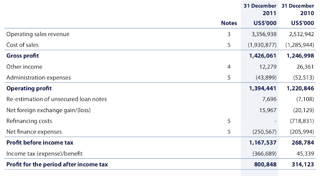 I want to draw attention to the critical lines. Iron ore revenue (in millions of USD) progresses from 10,048 to 11,139 to 20,412 in 2009 to 2011 inclusive.
